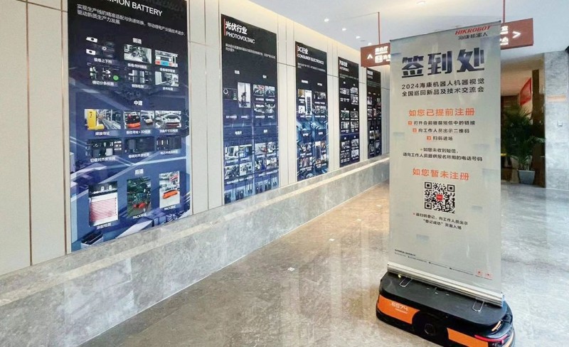 昆明站創(chuàng)新性地將機(jī)器視覺與AMR相結(jié)合,AMR載著機(jī)器視覺的易拉寶現(xiàn)場穿梭,為與會者傳遞活動信息,吸引了許多關(guān)注。
